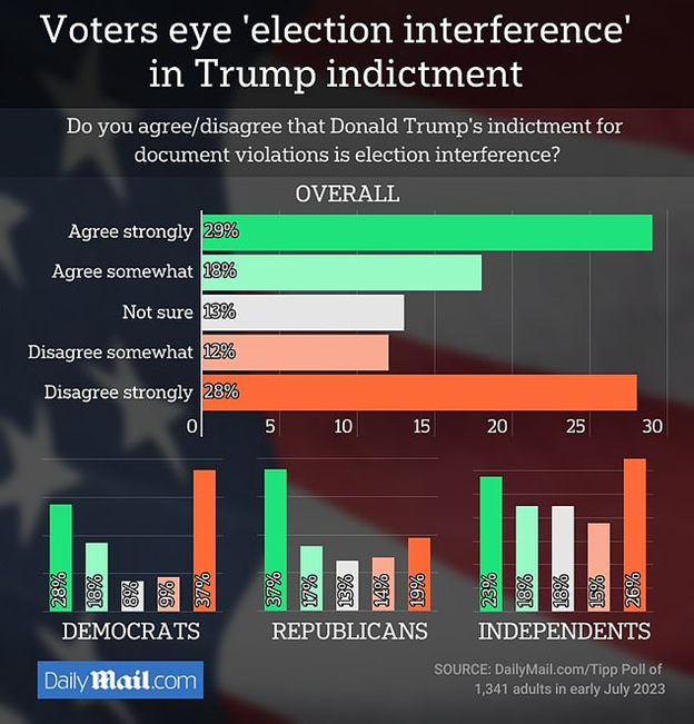 Nearly half of US voters see the prosecution of Donald Trump for mishandling classified documents as an effort to derail the former president's 2024 election bid, a DailyMail.com/TIPP Poll shows.