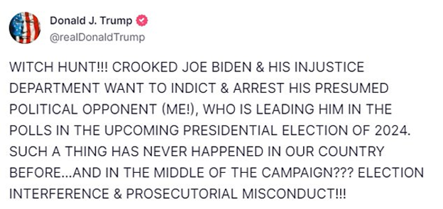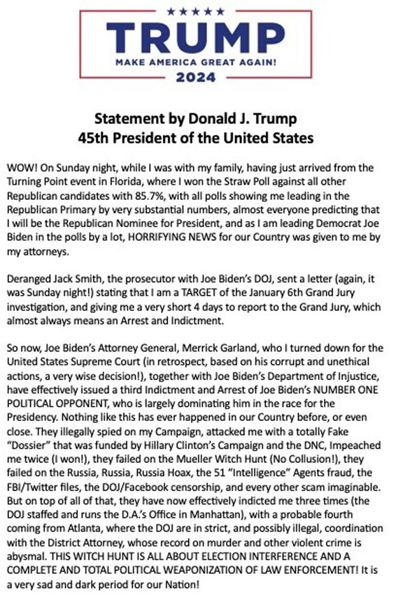 In the post, he ripped into Special Prosecutor Jack Smith, claimed the investigation is 'election interference' and accused President Joe Biden of 'going after his 'number one political opponent.'