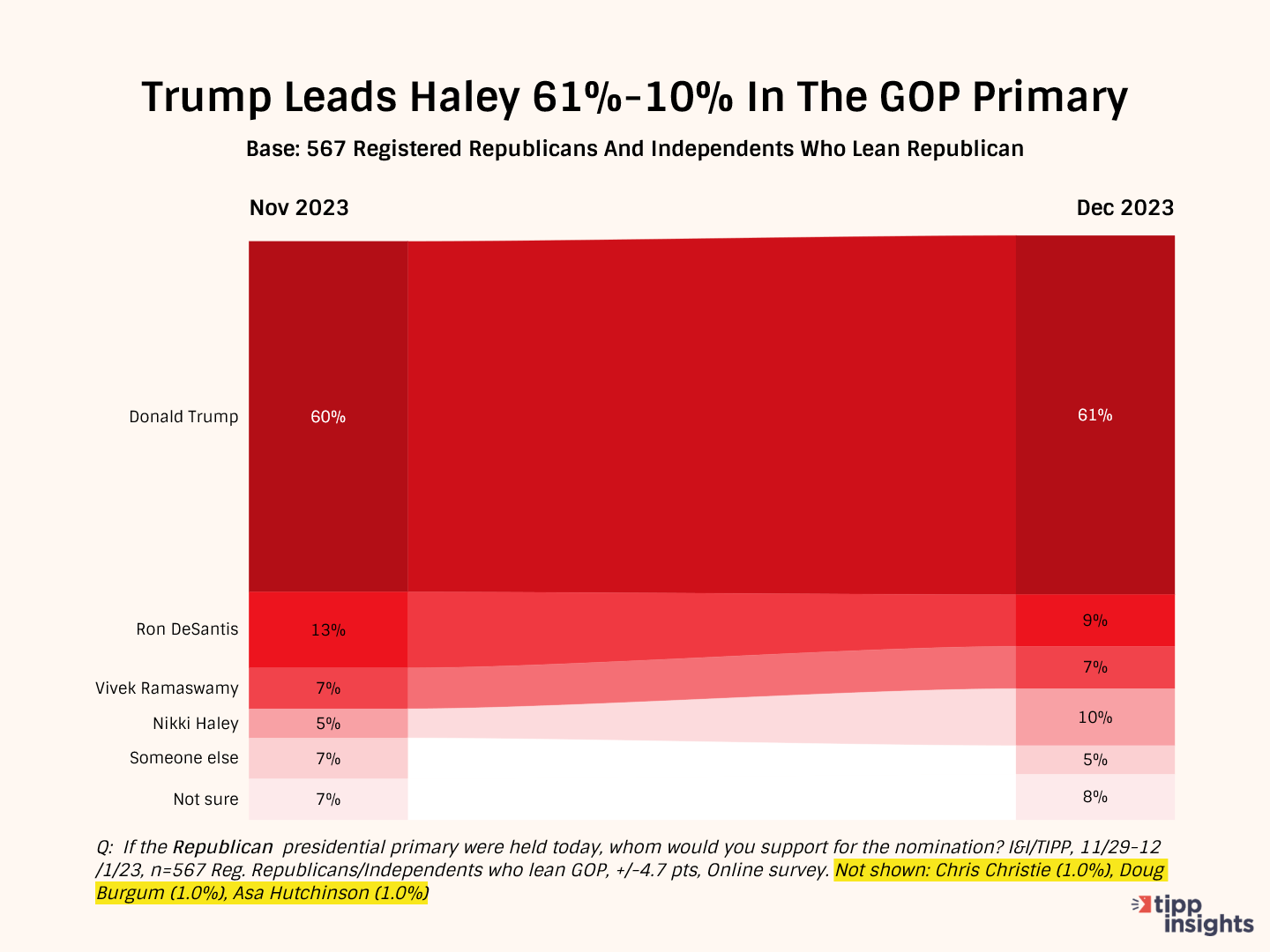 If current polls stand, it is almost impossible for Haley to beat Trump and win the nomination. Trump has a 35-point lead over her in Iowa, and the caucuses are scheduled on January 15, less than two weeks away. Besides, DeSantis has consistently been in second place in Iowa, having campaigned in all 99 counties. An Iowa win for Trump will translate into increased momentum in New Hampshire if history is any indication.