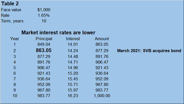 SVB took to the secondary bond market to buy its securities about a year after the initial treasury auction. Assume this was in March 2021, and the average yield on the bond market was 1.65% because interest rates had fallen. SVB paid $863.05, as indicated in Table 2. Had SVB held the bonds to full maturity, SVB could have collected the face value of the bond, $1,000.