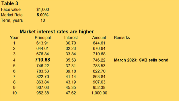 The Fed steadily began increasing interest rates starting in March 2022 and kept this up for nearly a year. SVB, having held its bonds for two years, decided to sell on the advice of Goldman Sachs, as seen in Table 3, when the market interest rate was much higher, at 5%. The only price acceptable to a buyer is $710.68 because they can take this up to maturity in the remaining six years and collect the full market interest value.