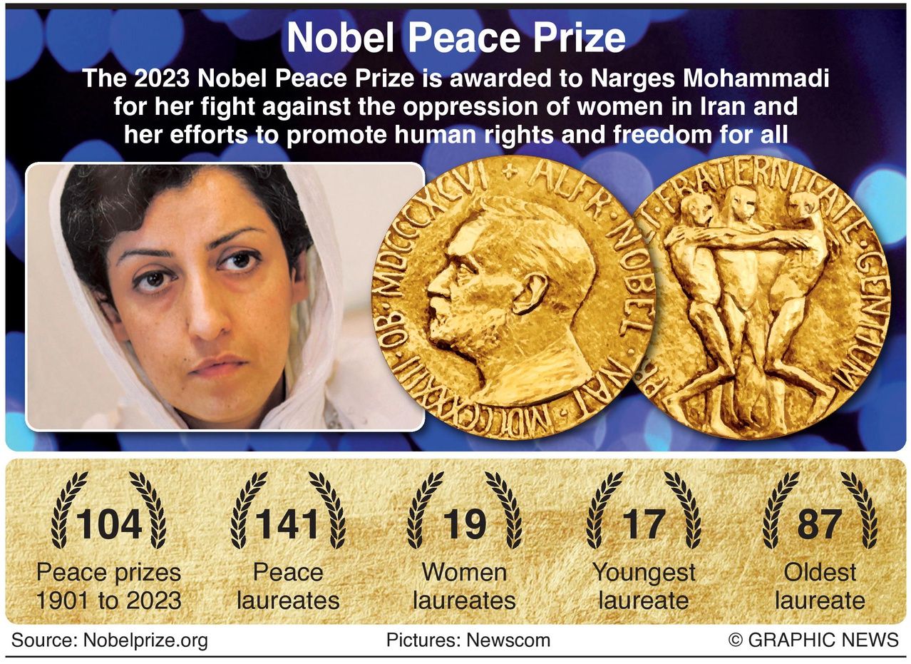 The 2023 Nobel Peace Prize is awarded to Narges Mohammadi for her fight against the oppression of women in Iran and her efforts to promote human rights and freedom for all.