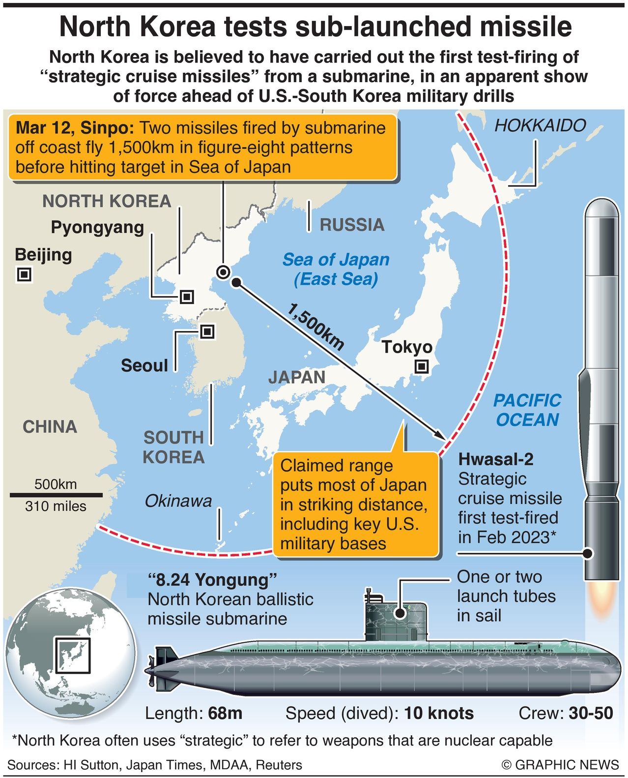 KCNA said the strategic cruise missiles were fired from the “8.24 Yongung” submarine in the water off the east coast of Korea in the early hours of Sunday.