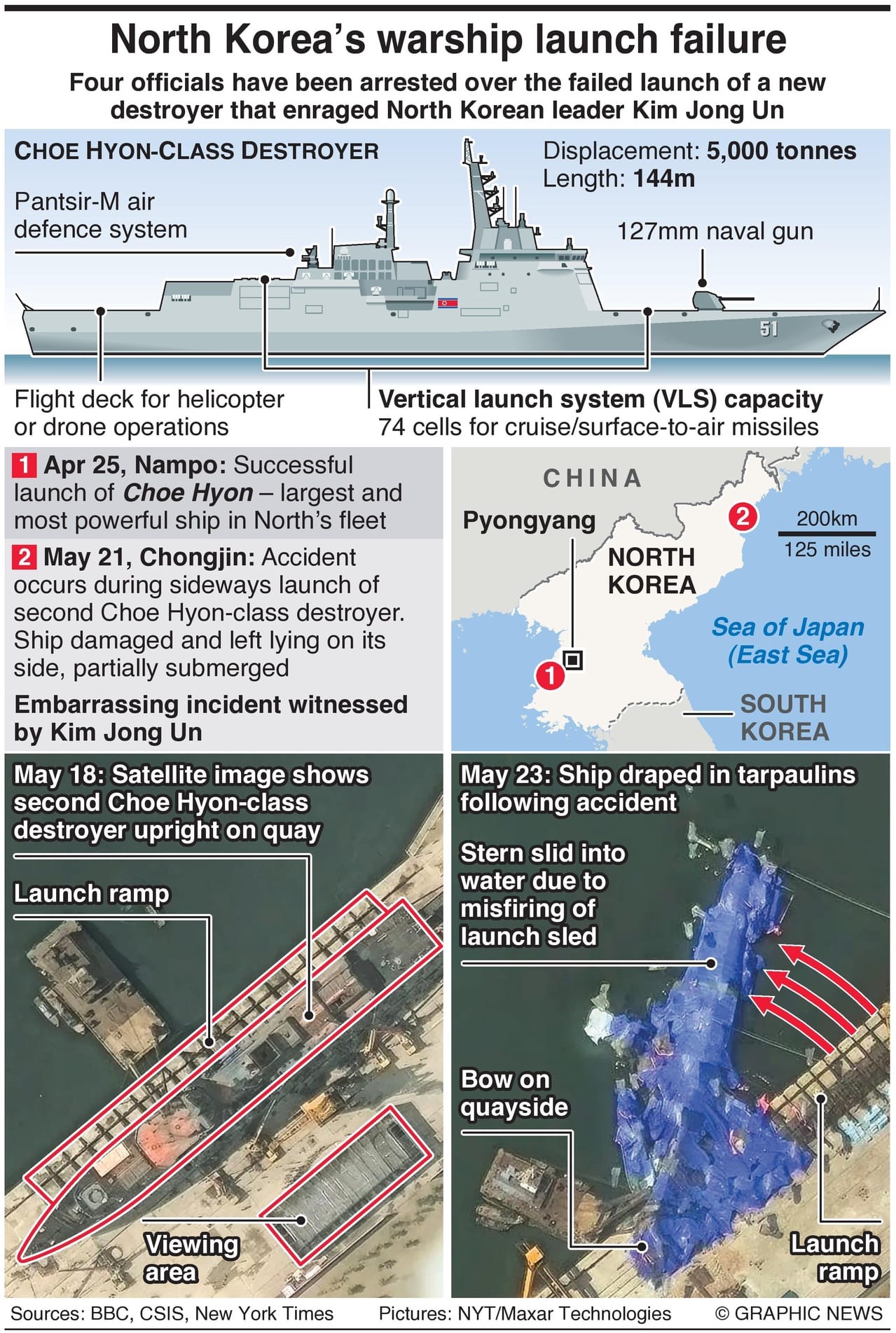 North Korea has arrested four officials over the failed launch of a new 5,000-tonne destroyer that enraged the country's leader, Kim Jong Un