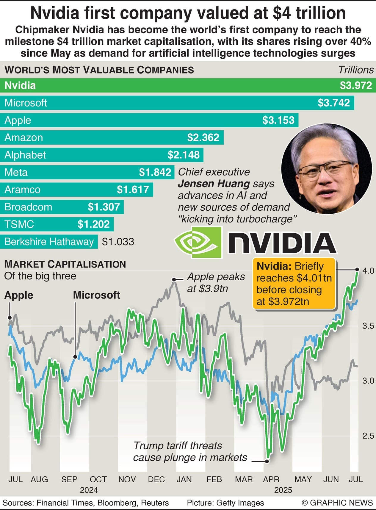Chipmaker Nvidia has become the world’s first company to reach the Milestone $4 trillion market capitalization, with its shares rising over 22% this year as demand for artificial intelligence technologies surges.