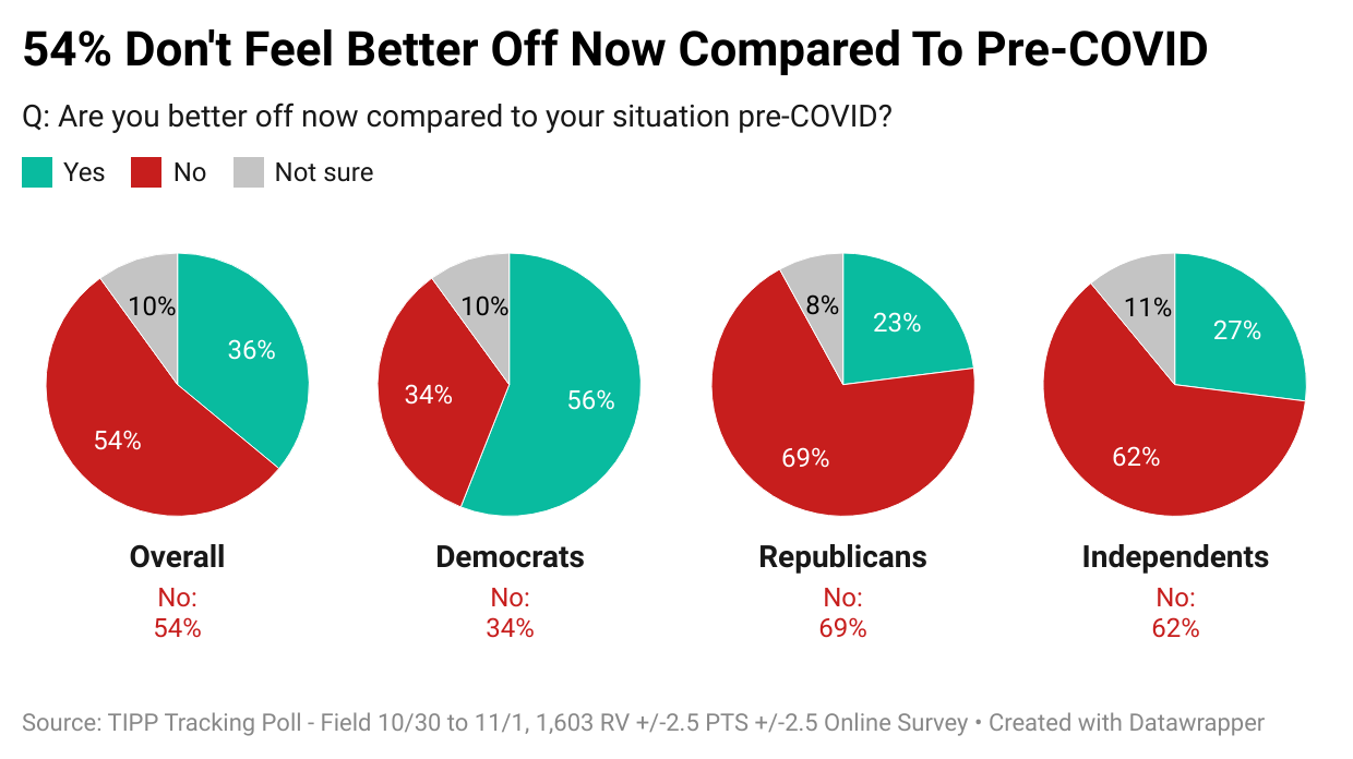 In a national online survey taken from Oct. 30 to Nov. 1, the TIPP Tracking Poll asked a series of four questions to 1,603 registered voters, with a margin of error of +/-2.5 percentage points. The responses suggest a majority of Americans harbor deep disappointments over the path the nation has traveled since the outbreak of COVID.