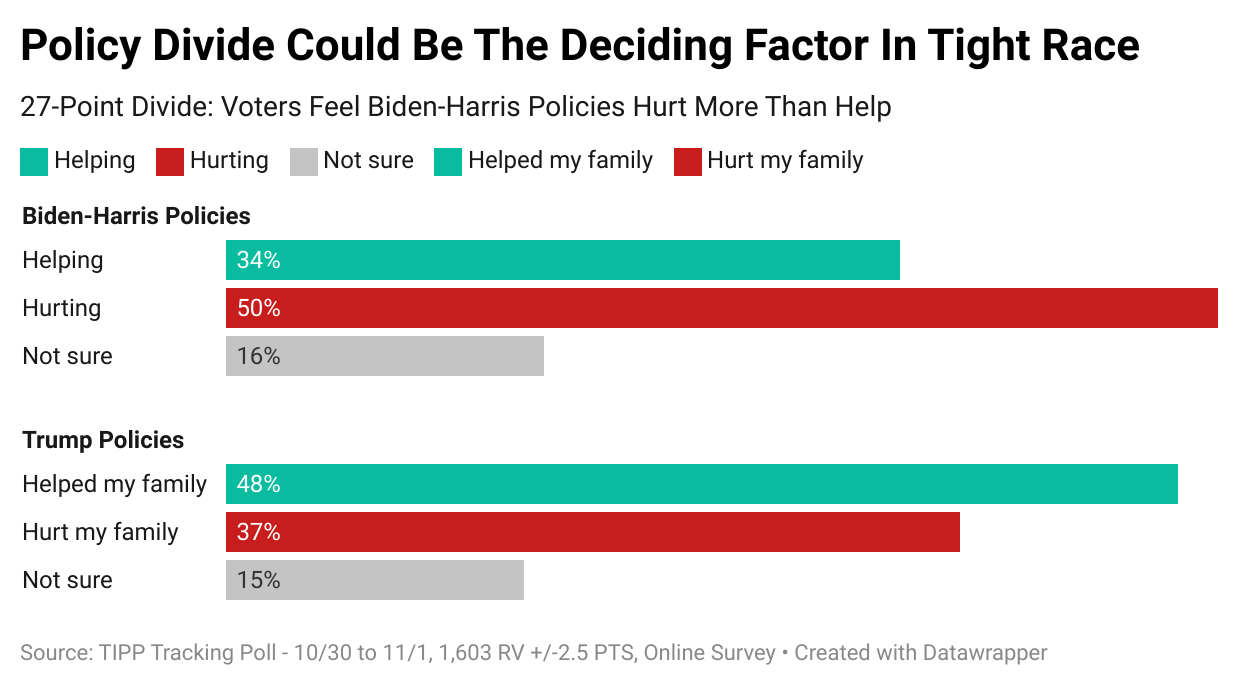 Specifically, TIPP asked first: “Are Biden and Harris’s policies helping or hurting your family?” and, second, “Did Trump’s policies help or hurt your family?”