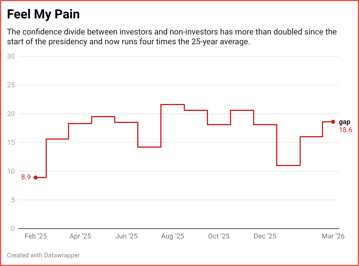 Start with investors versus non-investors. Respondents with at least $10,000 in the stock market registered 59.6 on the optimism index, comfortably above the neutral 50 line. Non-investors came in at 41.0. That 18.6-point gap is larger than the gap recorded in all but eight months of the Index's 302-month (25+ years) history. The historical average is 4.5 points.