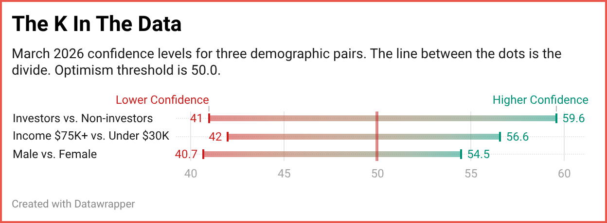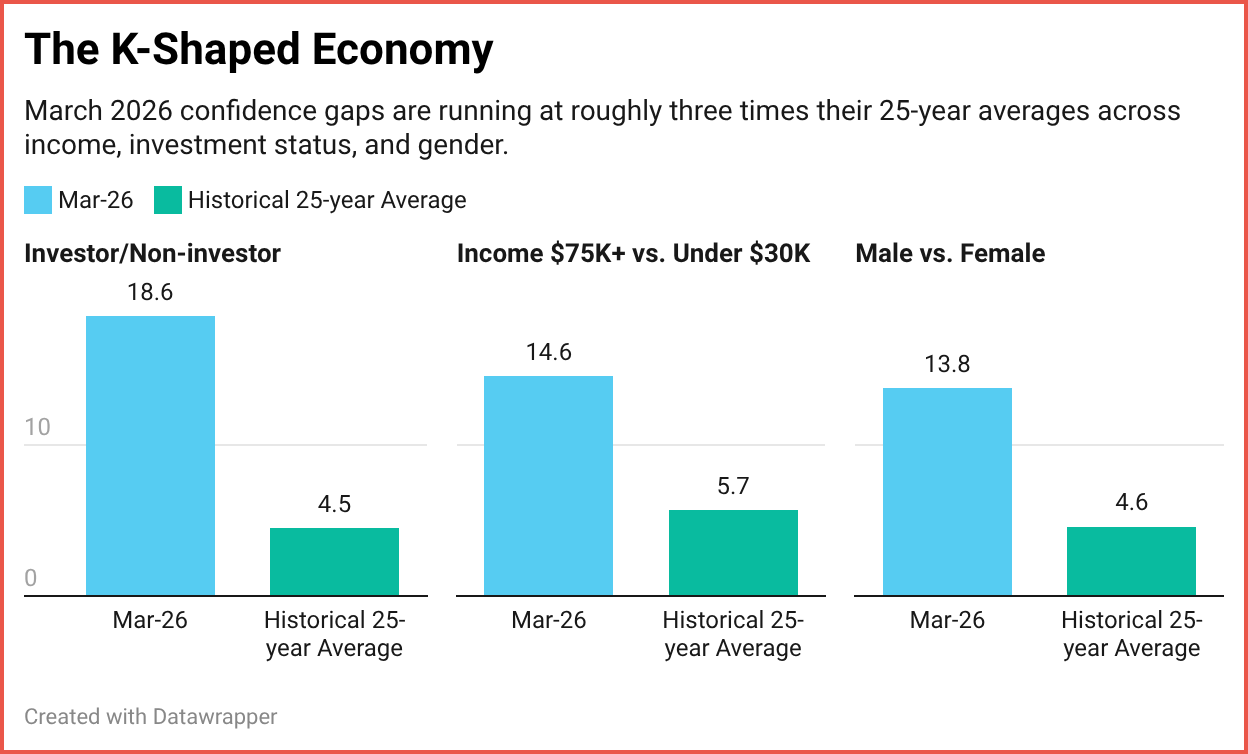 The two arms are moving apart. That is the critical point. It is not that all of America is going up or all of America is going down. Different groups of Americans are heading in opposite directions at the same time, and the March data shows this across income, gender, and investment status.