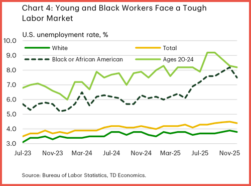 Unemployment has risen more sharply for vulnerable groups. Black unemployment climbed toward 8% in late 2025, while the rate for workers ages 20–24 approached 9%. By contrast, unemployment among white workers remained below 4%, underscoring widening disparities in the labor market.