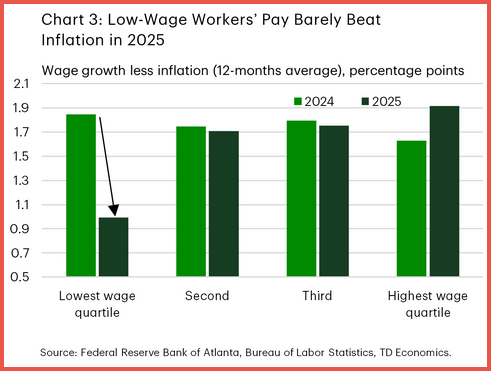 Wage growth is losing momentum for lower-income workers. In 2025, real wage gains for the lowest-paid workers fell to about 1 percentage point, down sharply from roughly 1.8 points in 2024. Higher-income workers saw steadier gains, highlighting the uneven pace of income growth.