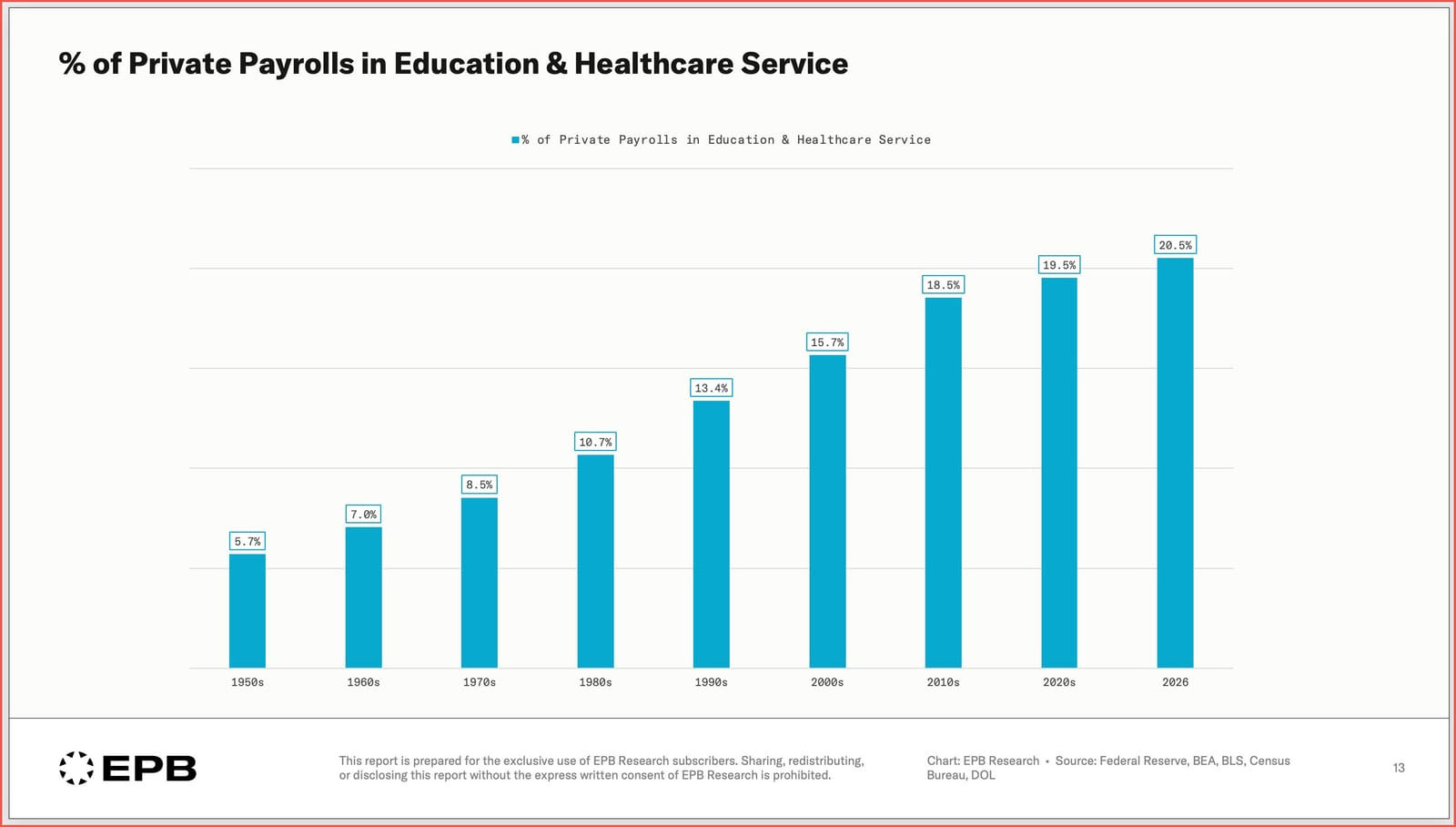 Employment in healthcare and education has steadily expanded for decades, rising from about 1 in 20 private-sector jobs in the 1950s to roughly 1 in 5 today, highlighting how services now dominate U.S. job growth.