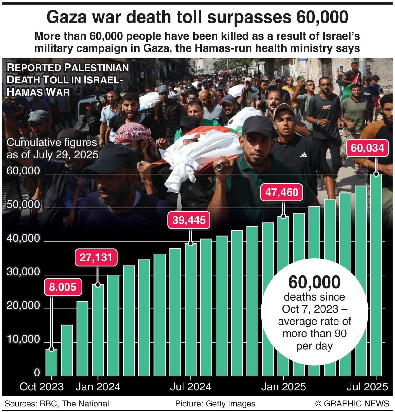 More than 60,000 people have been killed as a result of Israel’s military campaign in Gaza since October 2023, the Hamas-run health ministry says.