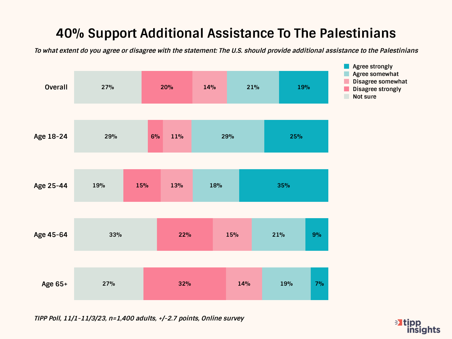 Overall, 40% agreed more aid should be provided, with 34% disagreeing and 27% unsure. Agreement was strongest among 18- to 24-year-olds, blacks and Hispanics, and liberals, with 54%, 56%, and 61% agreeing, respectively.