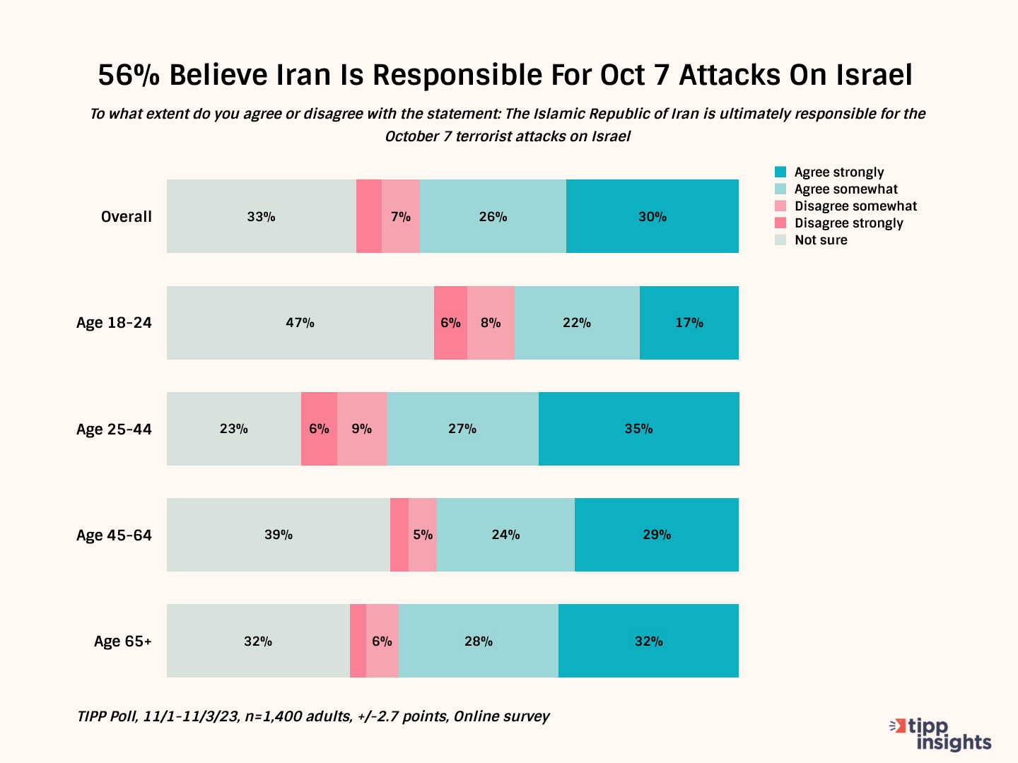 In response to the question “To what degree do you agree or disagree with this statement: ‘The Islamic Republic of Iran is ultimately responsible for the Oct. 7th attacks on Israel?’”, a majority of respondents (56%) agree strongly or somewhat.