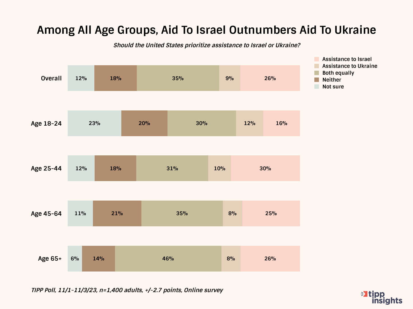 In response to the question “Should the United States prioritize aid to Israel or Ukraine,” the largest numbers of respondents favored aid to Israel (26%) or both countries equally (35%) for a total of 61%. Only 9% favor prioritizing Ukraine, while 12% are unsure.