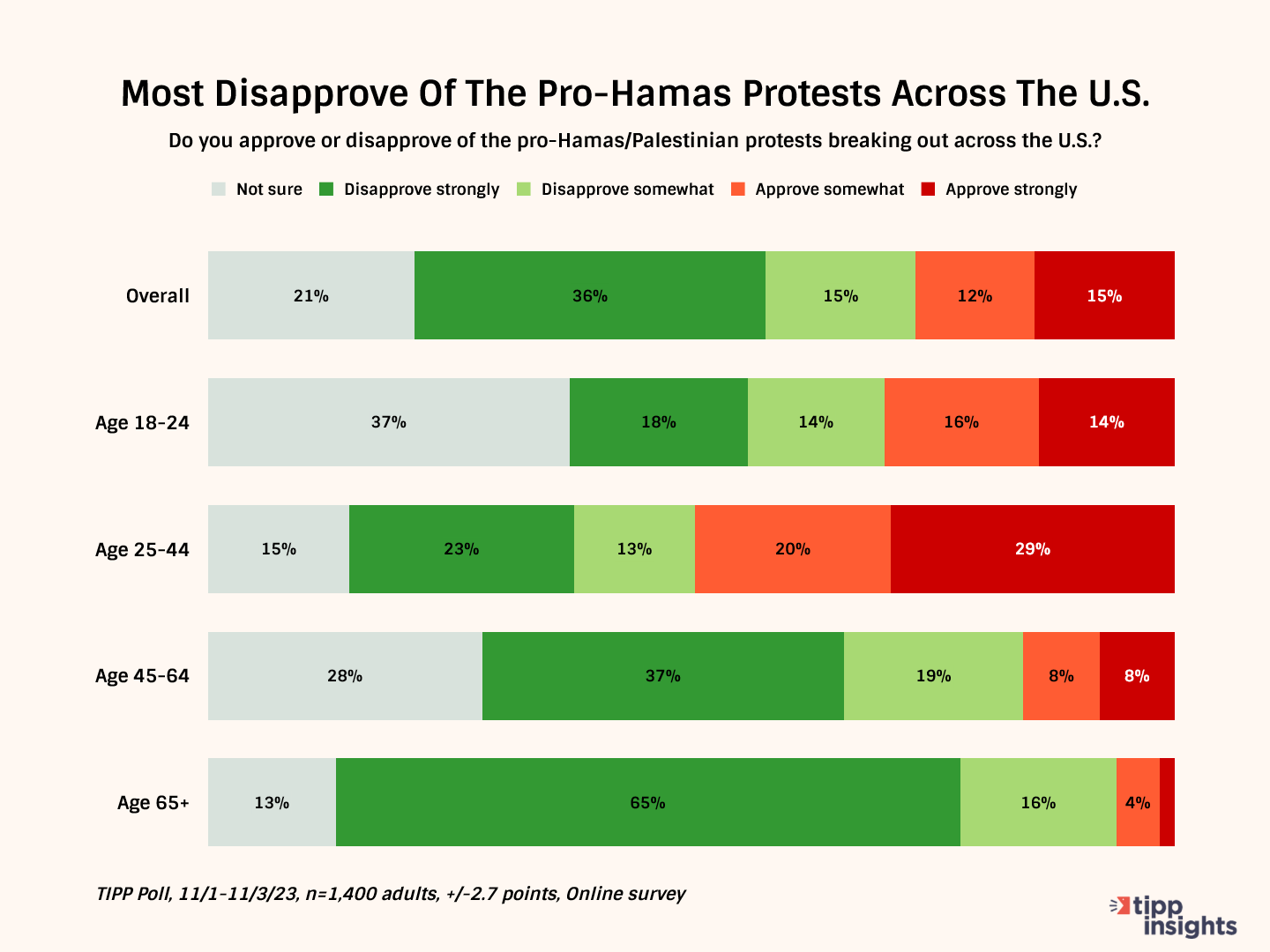 Once again, the 18 to 24 age bracket was the most evenly split with 32% disapproving and 30% approving—but even more respondents (37%) were unsure, suggesting that even with the public support these demonstrations are receiving on college campuses, there may be more ambiguity among students than has been documented.