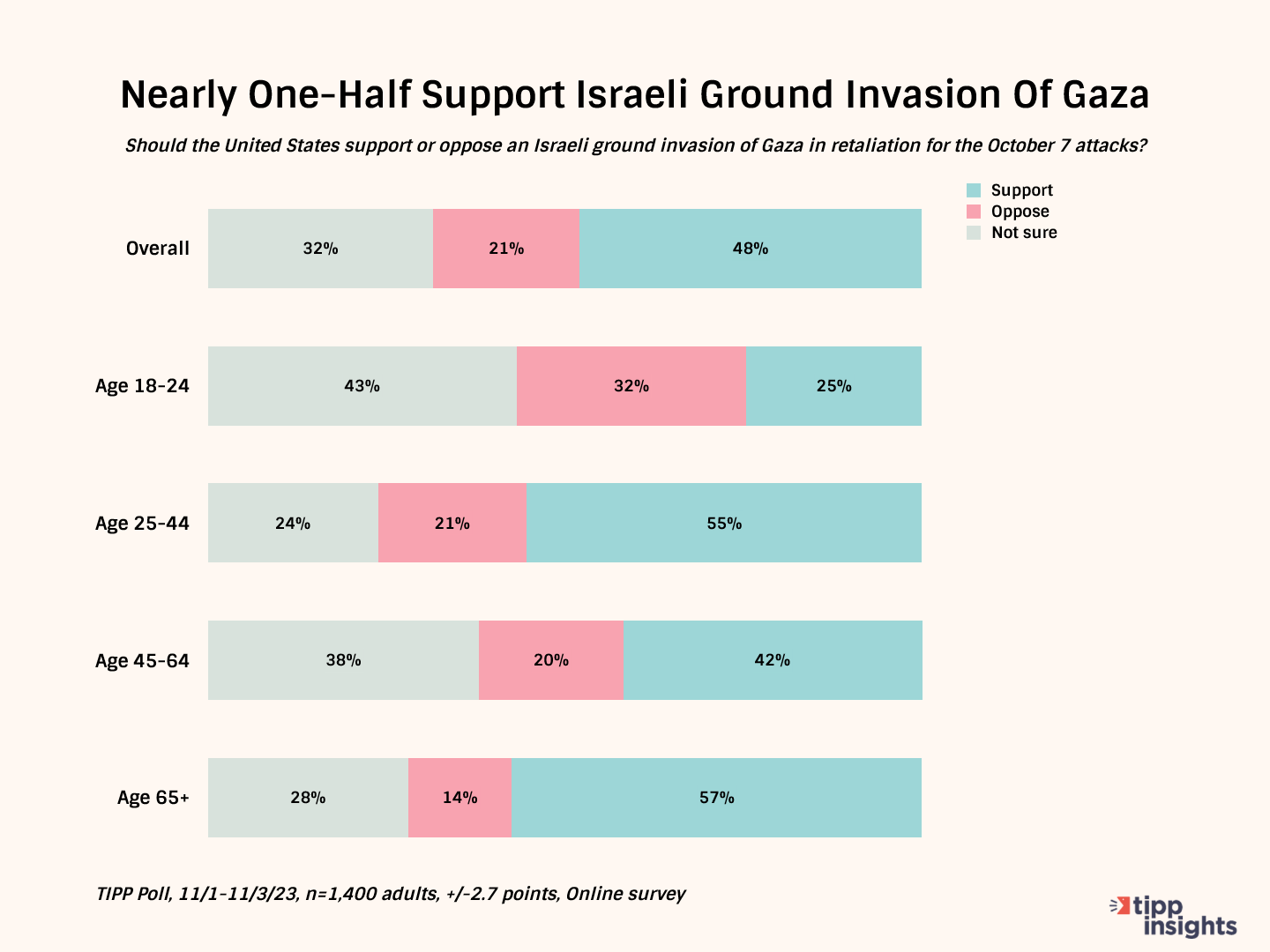 In response to the question, “Should the United States support or oppose an Israeli ground invasion of Gaza in retaliation to the Oct. 7th attacks?” support outweighs opposition across all respondents at a roughly 2-to-1 margin, with the sole exception of the 18- to 24-year-old age group.