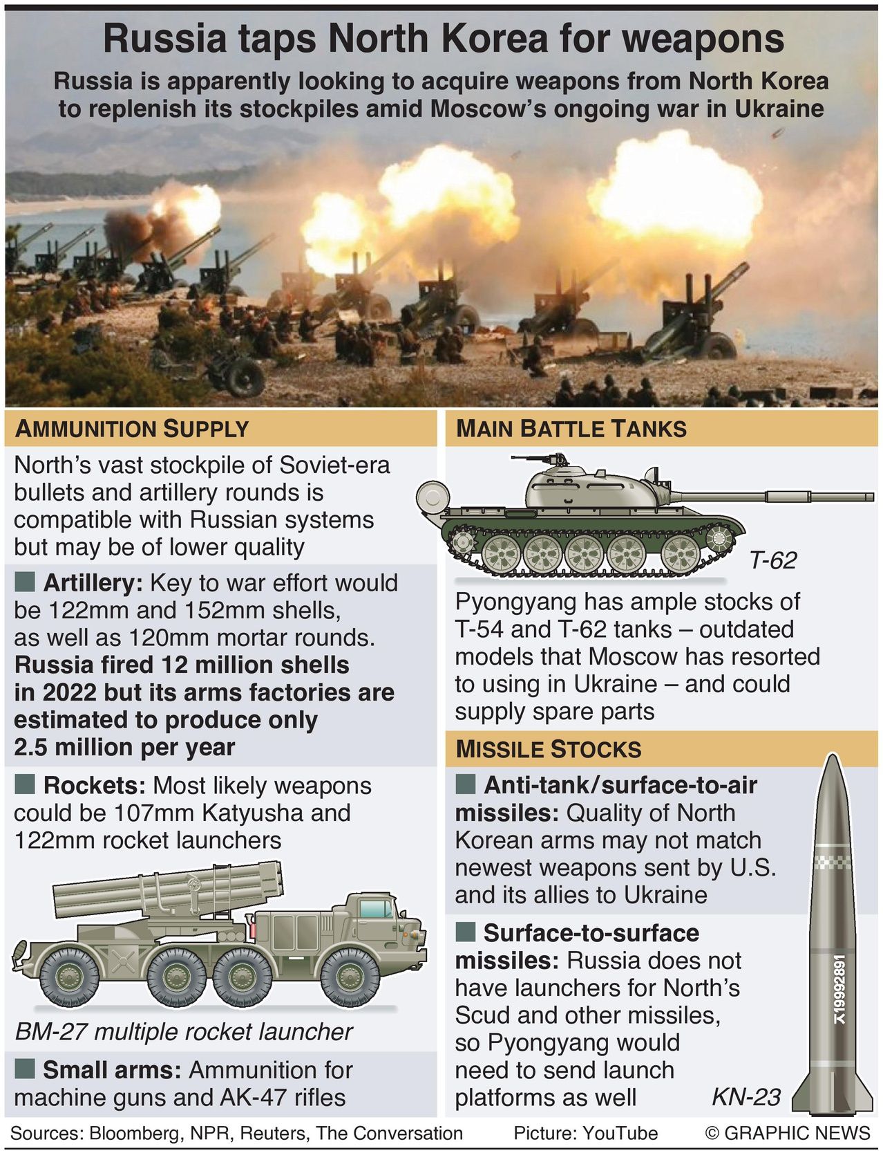 While Pyongyang and Moscow have denied U.S. accusations of arms transfers, North Korea sits on some of the largest stockpiles of artillery and unguided rockets that could be used in the Soviet-era weaponry Russia is using to launch indiscriminate attacks on Ukraine, Bloomberg said.