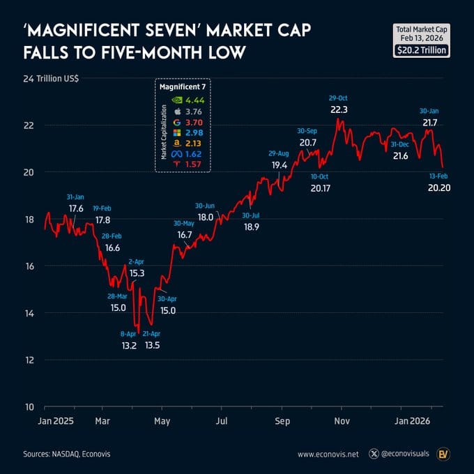 The combined market value of the Magnificent Seven has fallen to about $20 trillion, its lowest level in five months, reflecting recent tech-sector weakness after last year’s strong rally. Current market caps are Nvidia ($4.44T), Apple ($3.76T), Alphabet ($3.70T), Microsoft ($2.98T), Amazon ($2.13T), Meta ($1.62T), and Tesla ($1.57T).