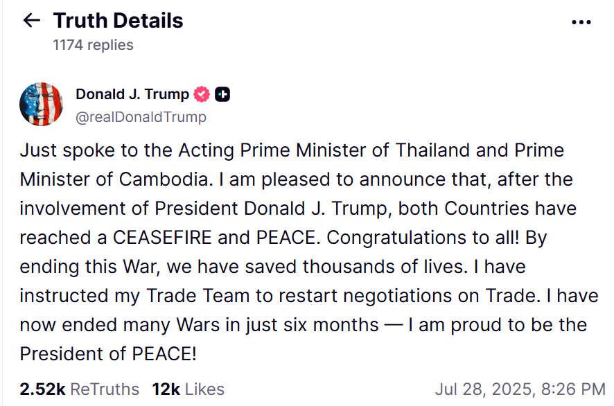 President Donald Trump posted on Truth Social that his involvement led to a ceasefire between Cambodia and Thailand, declaring, “after the involvement of President Donald J. Trump, both countries have reached a ceasefire and peace.”