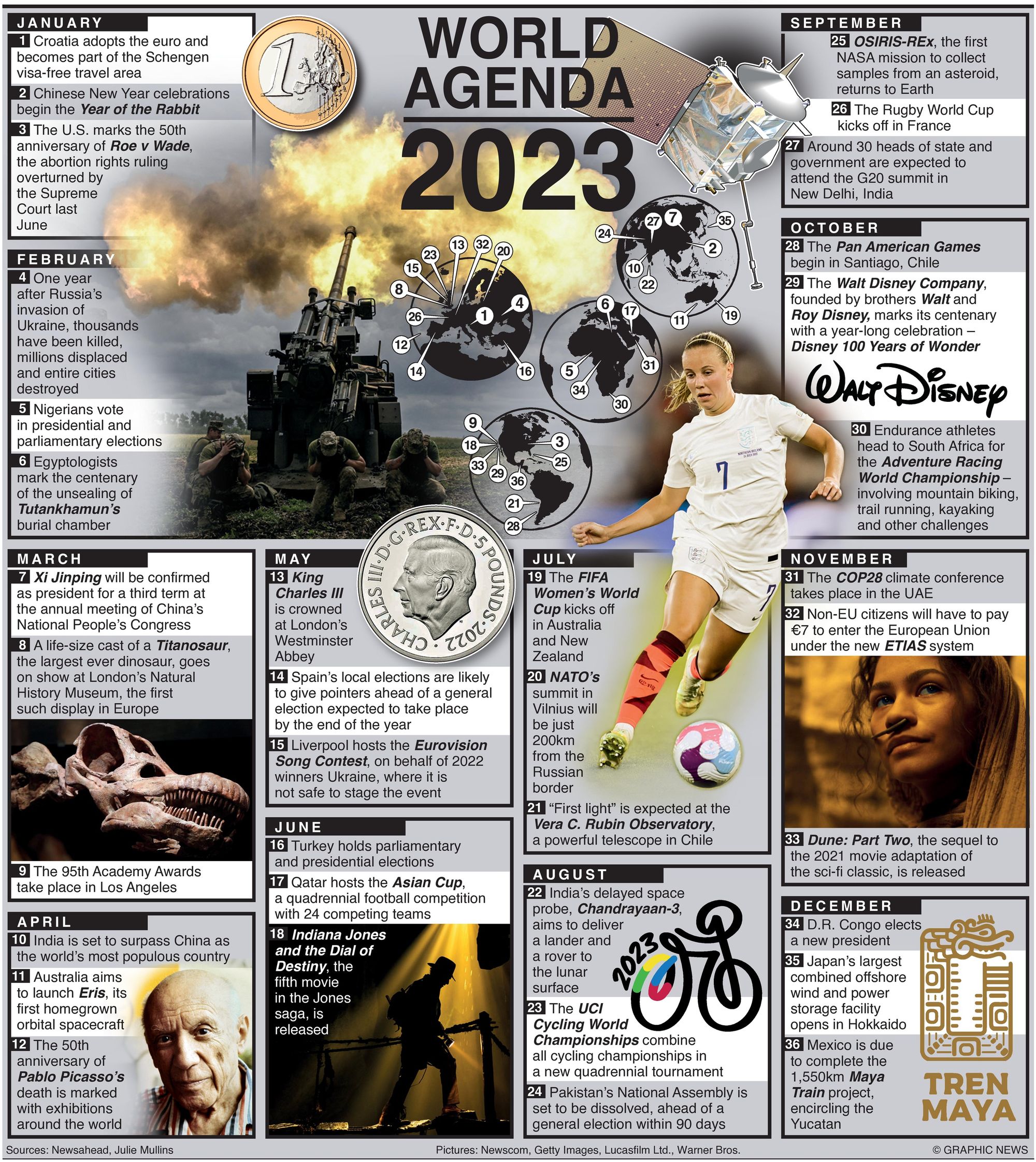 Selected events scheduled during 2023 include crucial elections in Nigeria, Spain, Turkey, Pakistan, and D.R. Congo and the first anniversary of Russia's invasion of Ukraine. Croatia adopts the euro, King Charles III is crowned at Westminster Abbey, and the Walt Disney Company marks its centenary. Sporting highlights include the FIFA Women's World Cup, the Rugby World Cup, Pan American Games, and the Asian Cup.