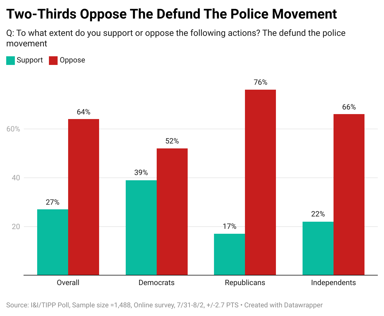 The truth is that there was never any broad-spectrum support for reducing spending on the police force. A November 2023 TIPP Poll for the National Sheriffs Association showed that six in ten (60%) Americans opposed the movement. Furthermore, another 42% said the movement reduced their community's safety. A TIPP Poll from August of this year also showed similar results. Voters strongly opposed the idea, 64% to 27%. All major political parties opposed it: Democrats (52% oppose, 39% support), Republicans (76% to 17%), and independents (66% to 22%). Increasing crime rates nationwide due to local governments cutting police spending proved to be highly unpopular with voters.