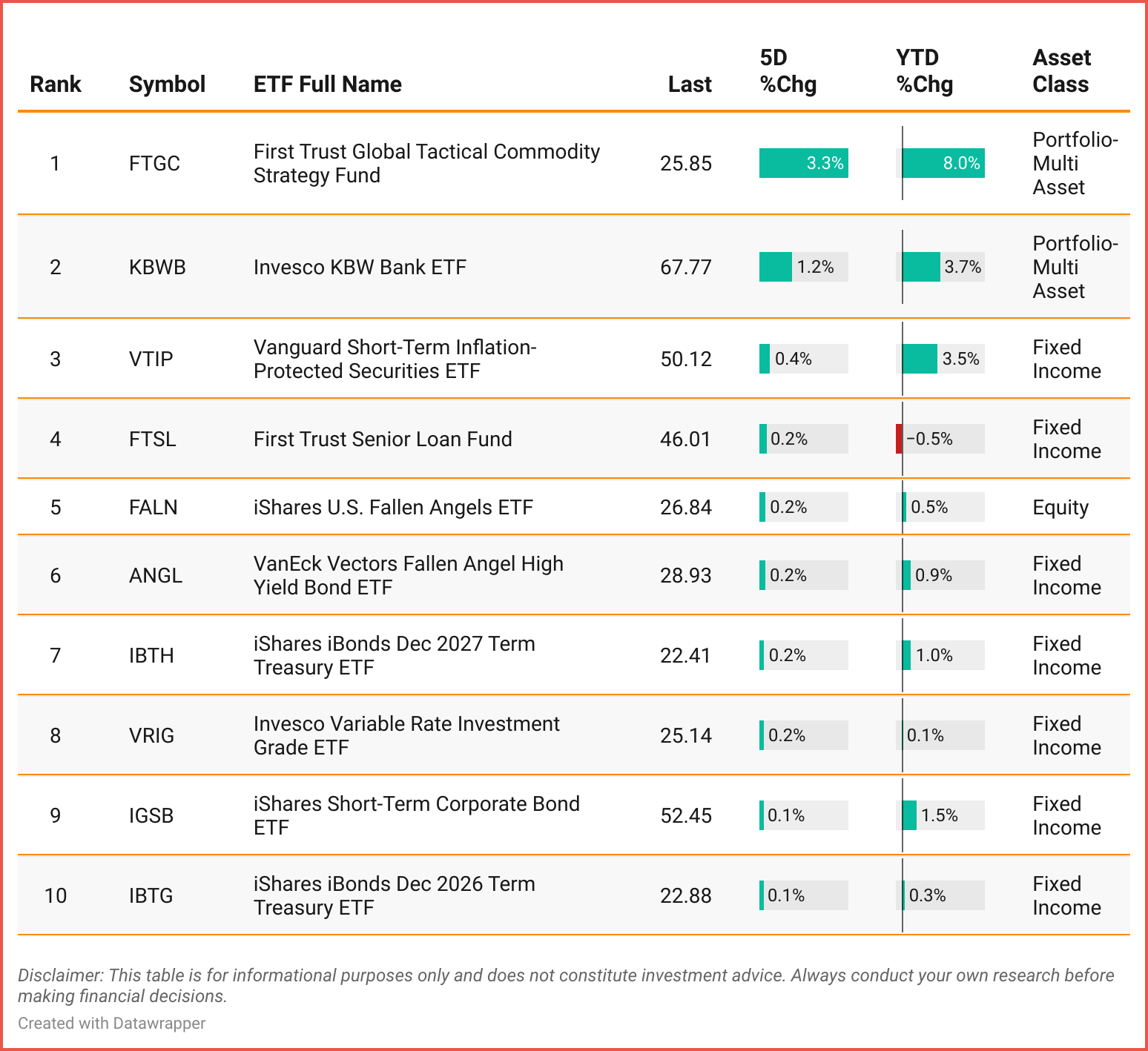 Tickers: FTGC | KRWB | VTIP | FTSL | FALN | ANGL | IBTH | VRIG |IGSB | IBTG