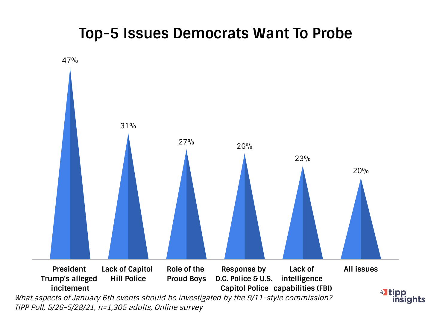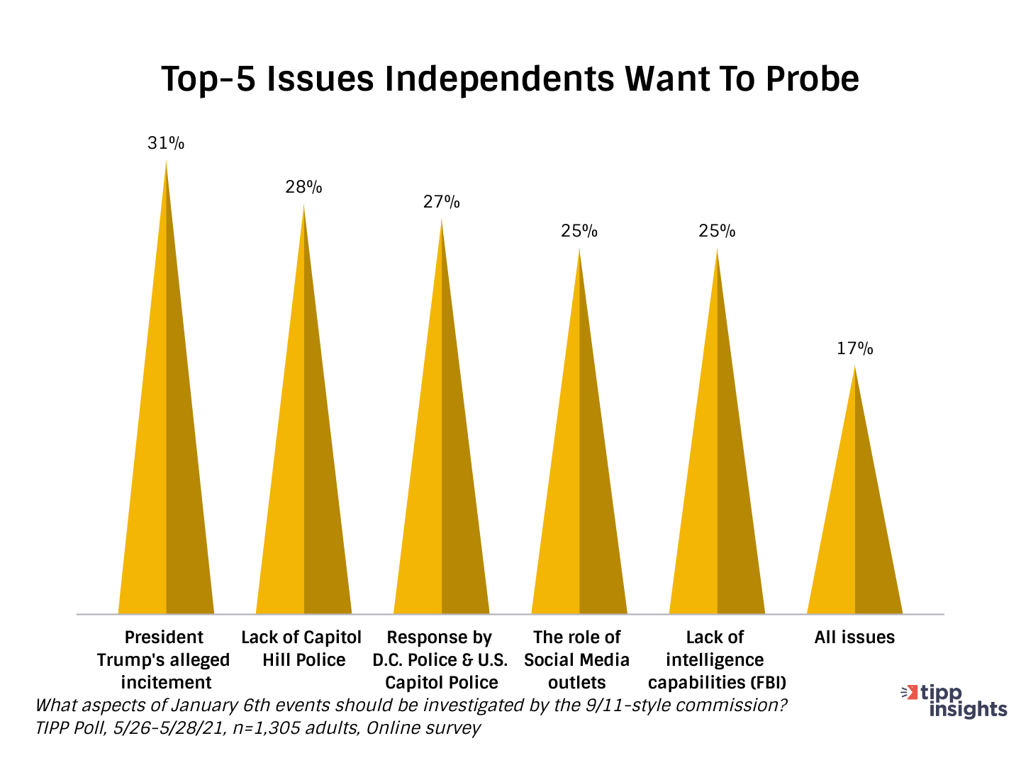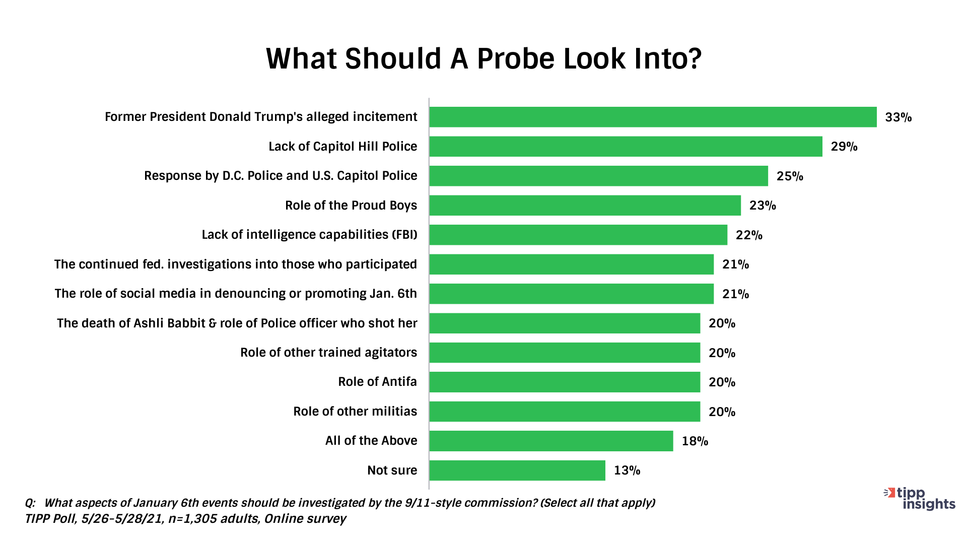 To answer this question, we asked the American public in a TIPP Poll in late May, "What aspects of January 6th events should be investigated by the 9/11-style commission?"