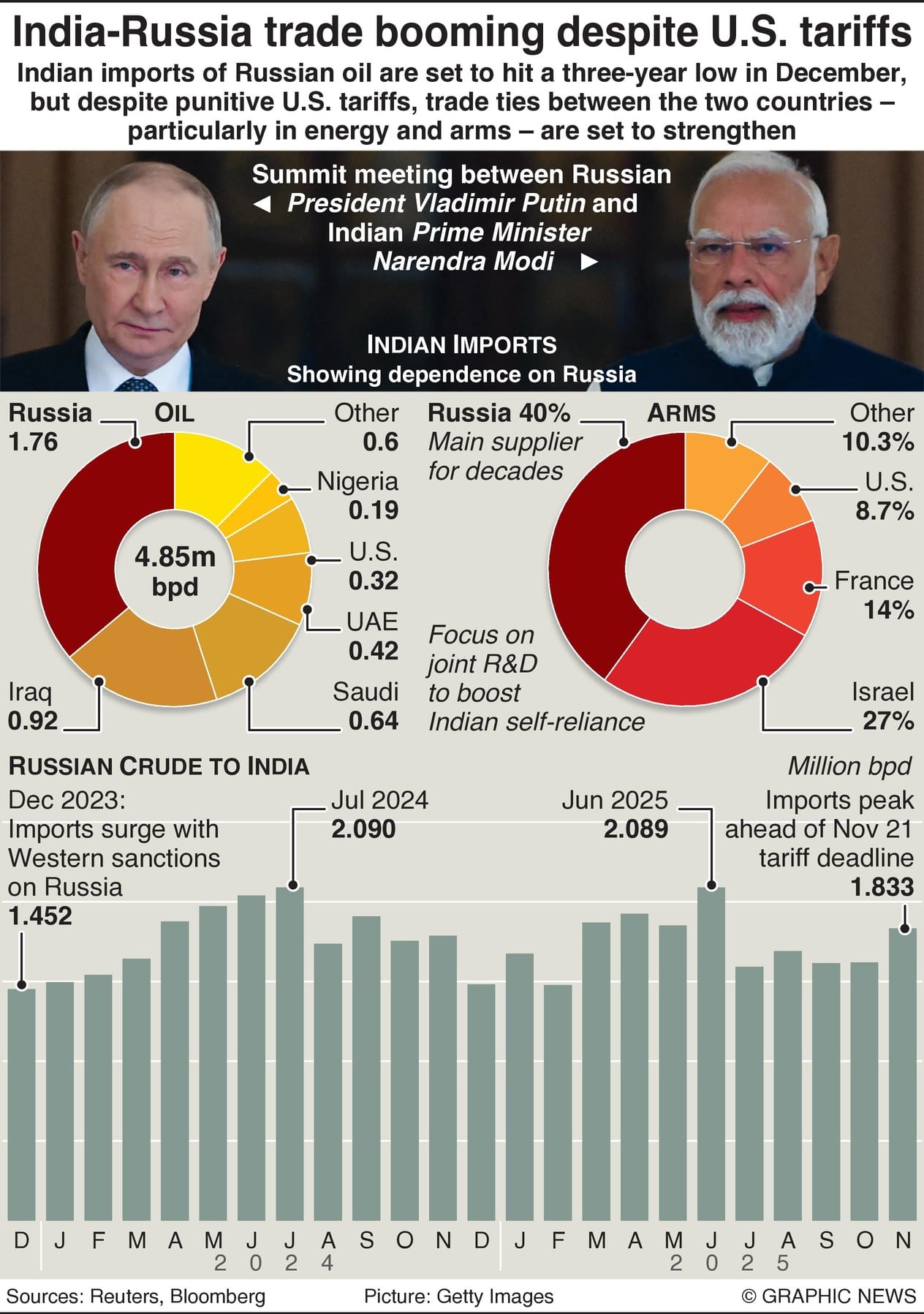 Indian imports of Russian oil are set to hit a 3-year low in December, but despite punitive U.S. tariffs, trade ties between the two countries – particularly in energy and arms – are set to strengthen.