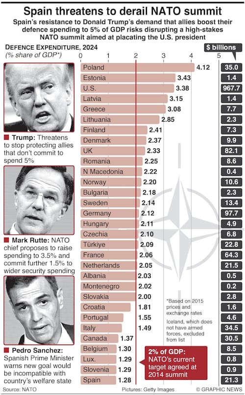 Spain’s resistance to Donald Trump’s demand that allies boost their defence spending to 5% of GDP risks disrupting a high-stakes NATO summit aimed at placating the U.S. president.