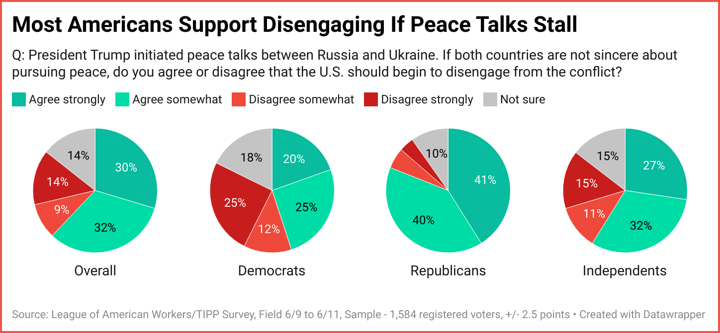 A new TIPP survey for the League of American Workers shows that 62% of Americans support disengaging from the Russia-Ukraine conflict if peace talks initiated by President Trump are met with insincerity from both sides. Support spans party lines, with most Republicans (81%), a majority of independents (59%), and even a significant share of Democrats (45%) in favor of stepping back.