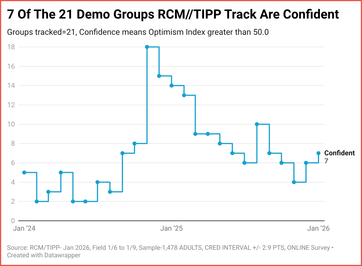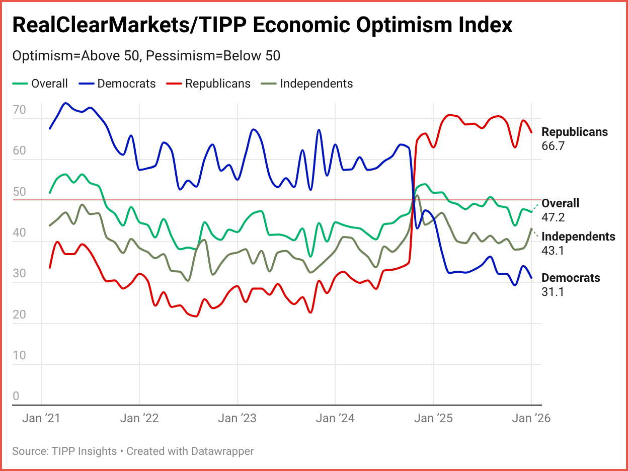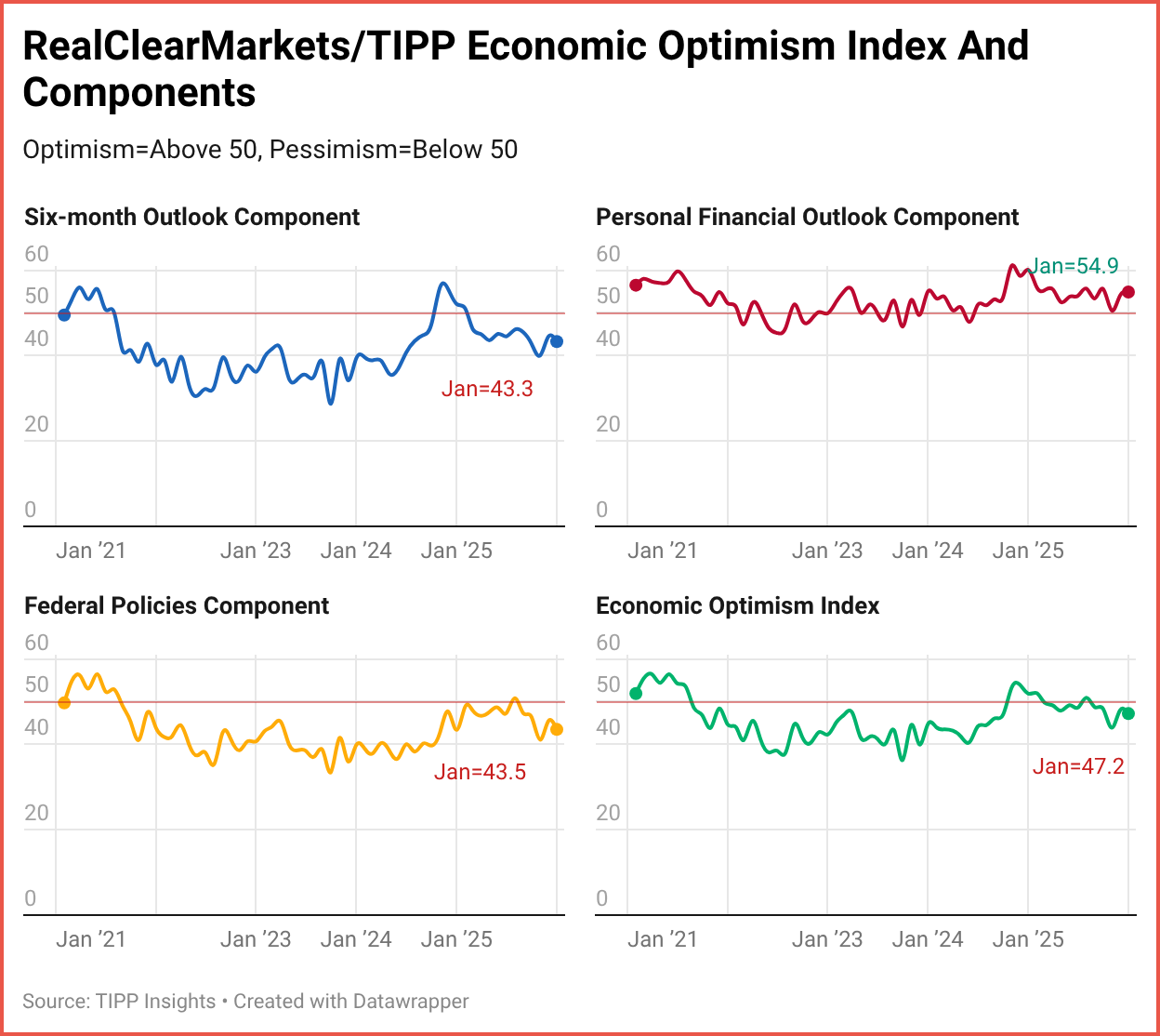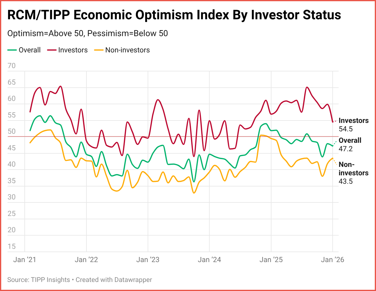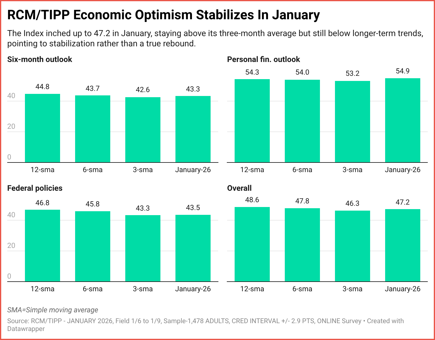 RCM/TIPP surveyed 1,478 adults from January 6 to 9 for the January Index, using TIPP’s panel network; results have a range of 0–100, with readings above 50 indicating optimism, below 50 signaling pessimism, and 50 considered neutral. A more detailed methodology is available here.