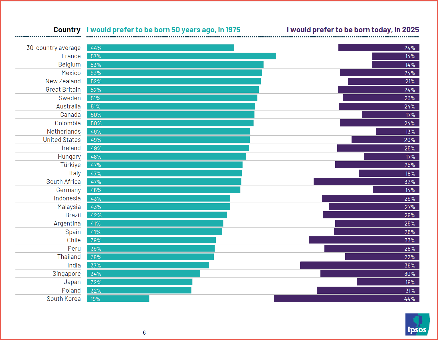 When asked, “If you had to choose between being born 50 years ago or being born today, which would you choose?” people across 30 countries overwhelmingly picked the past. In the United States, nearly one in two would rather have been born in 1975 than in 2025, while only one in five prefer being born today, reflecting a deep global loss of optimism about the future.