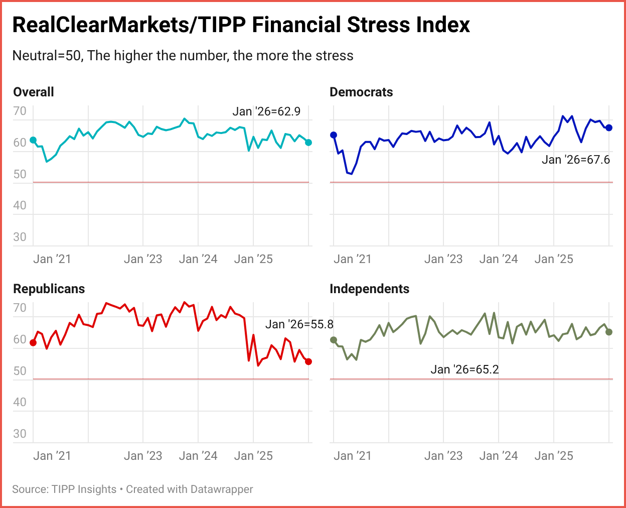 The RCM/TIPP Financial-Related Stress Index fell 1.3 points (2.0%) from 64.2 in December to 62.9 in January, indicating a decline in financial stress among Americans. This reading remains 4.0% above the long-term average of 60.5, underscoring elevated financial strain. The last time the Index posted below 50.0 was before the onset of the pandemic in February 2020, when it stood at 48.1.