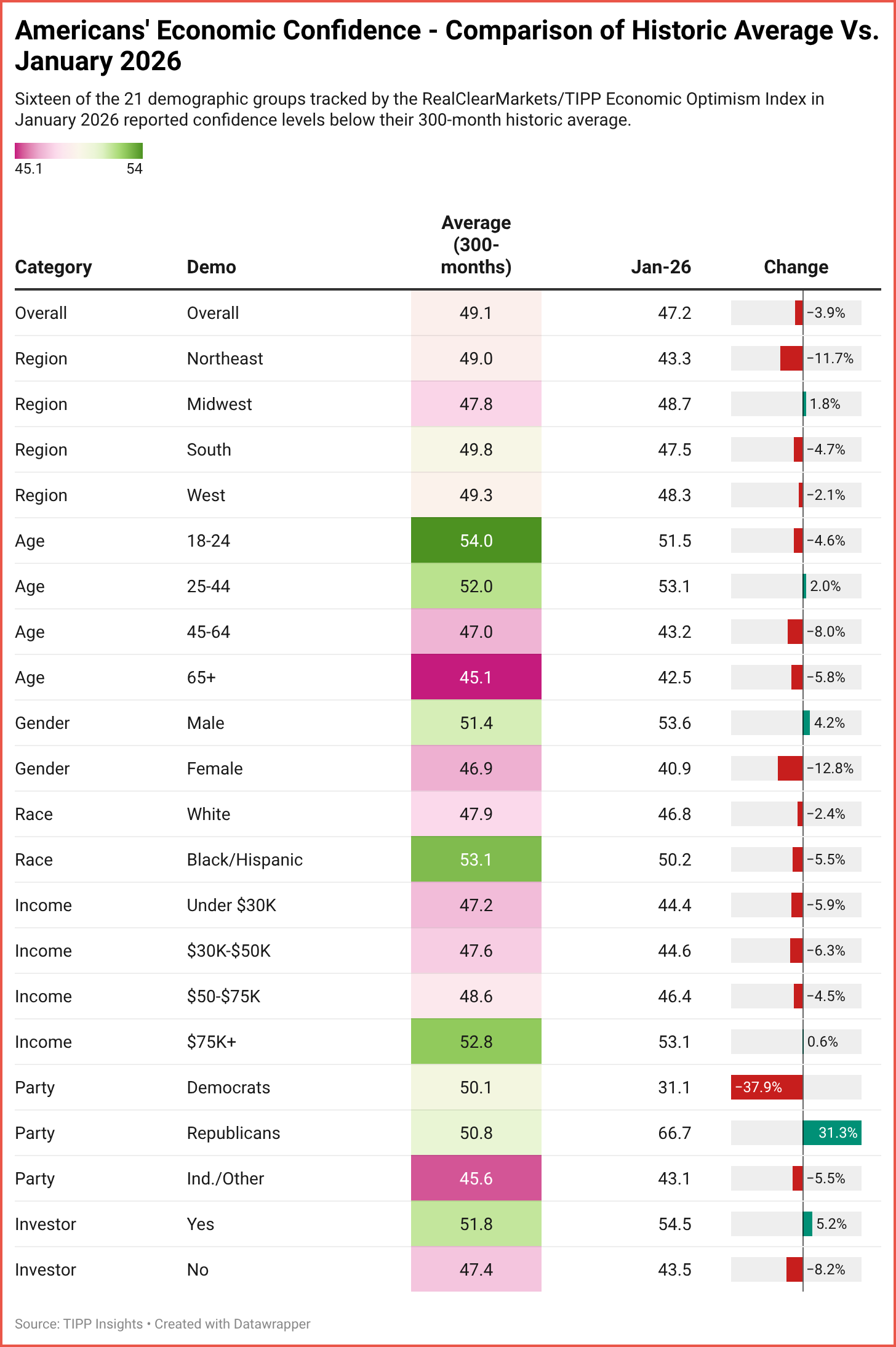 Economic optimism levels for 16 of 21 demographic groups are lower in January 2026 than the historical average over the 300 months since we began tracking in February 2001.