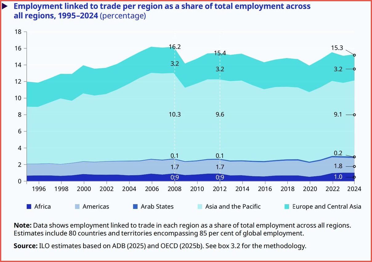 The chart shows the share of all global jobs that exist because people in other countries are buying goods and services. Today, about 15 out of every 100 jobs worldwide are supported by foreign demand, up sharply since the 1990s. Most of these trade-linked jobs are now in Asia and Europe, showing how deeply global employment has become tied to international supply chains.