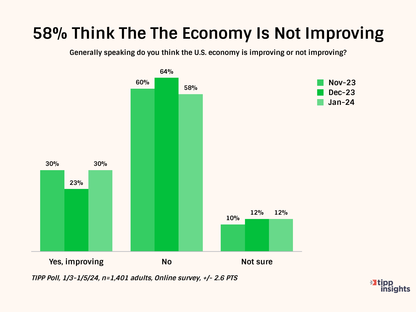 In January, over one-half (58%) think the U.S. economy is not improving, while 30% believe it is improving.