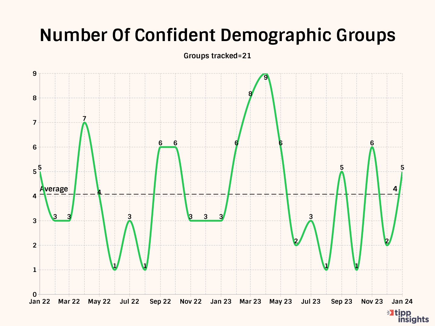 The number of groups in the positive zone indicates the breadth of optimism in American society. This month, five of the 21 demographic groups we track—such as age, income, education, and race—are above 50.0, indicating optimism on the Economic Optimism Index. Starting with three groups in January 2023, we saw steady improvement, peaking at nine groups in April and then a decline to return to one group in August. Since August, it has moved in the range of one to six. 19 of the 21 groups posted increased confidence in January compared to eight in December.
