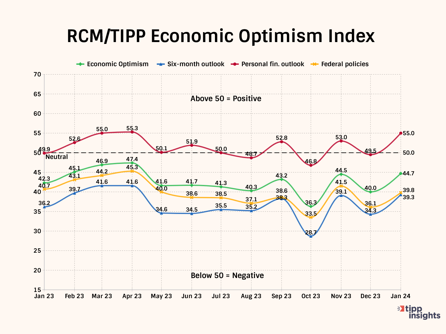 The RCM/TIPP Economic Optimism Index is the first monthly measure of consumer confidence. It accurately predicts monthly changes, as reflected in other well-known surveys by The Conference Board and the University of Michigan.
