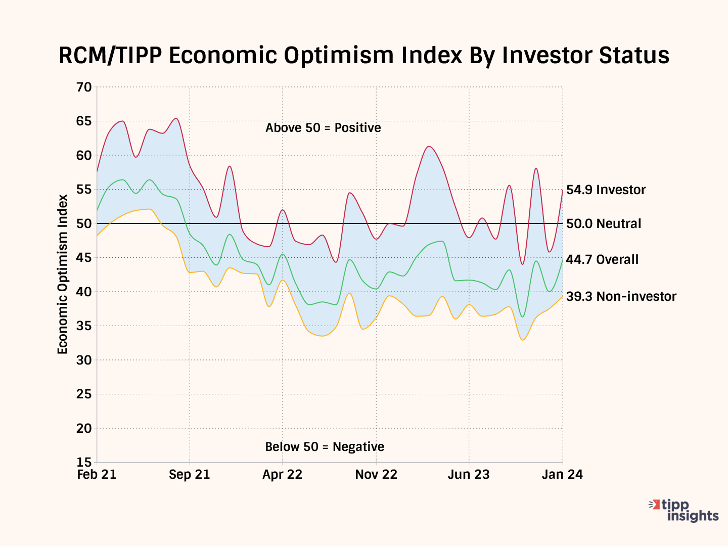 The economic optimism gap between investors and non-investors is 15.6 in January, widening from 8.3 in December.