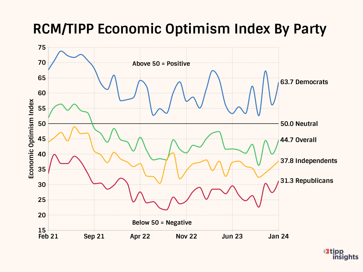 Independents’ confidence has been in pessimistic territory for 46 months since April 2020, the month after the onset of the pandemic. Independents gained 2.1 points and posted 37.8 on the index in January.