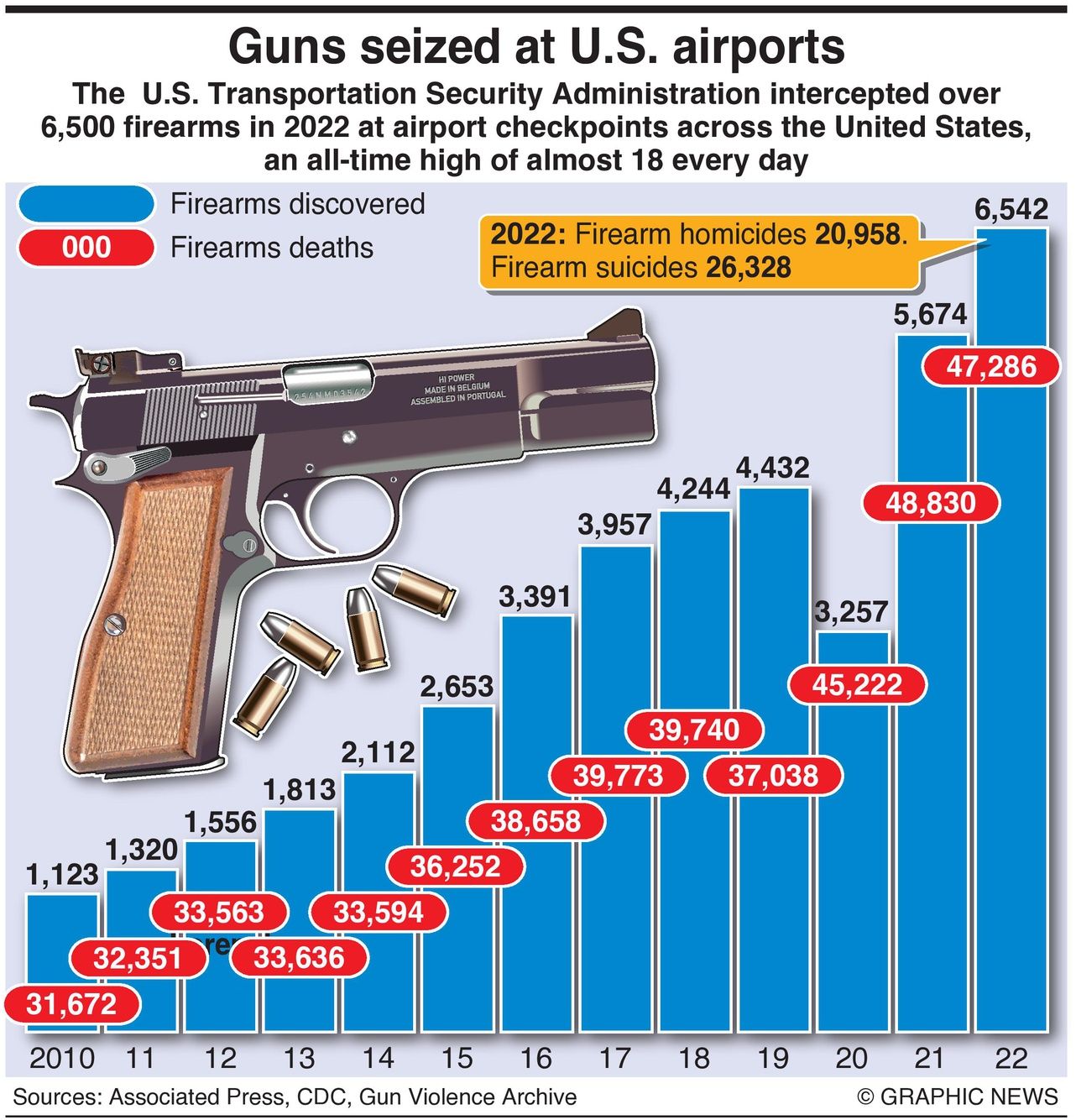 Except for 2020, hit by the pandemic, the number of weapons intercepted at airport checkpoints has climbed yearly since 2010.
