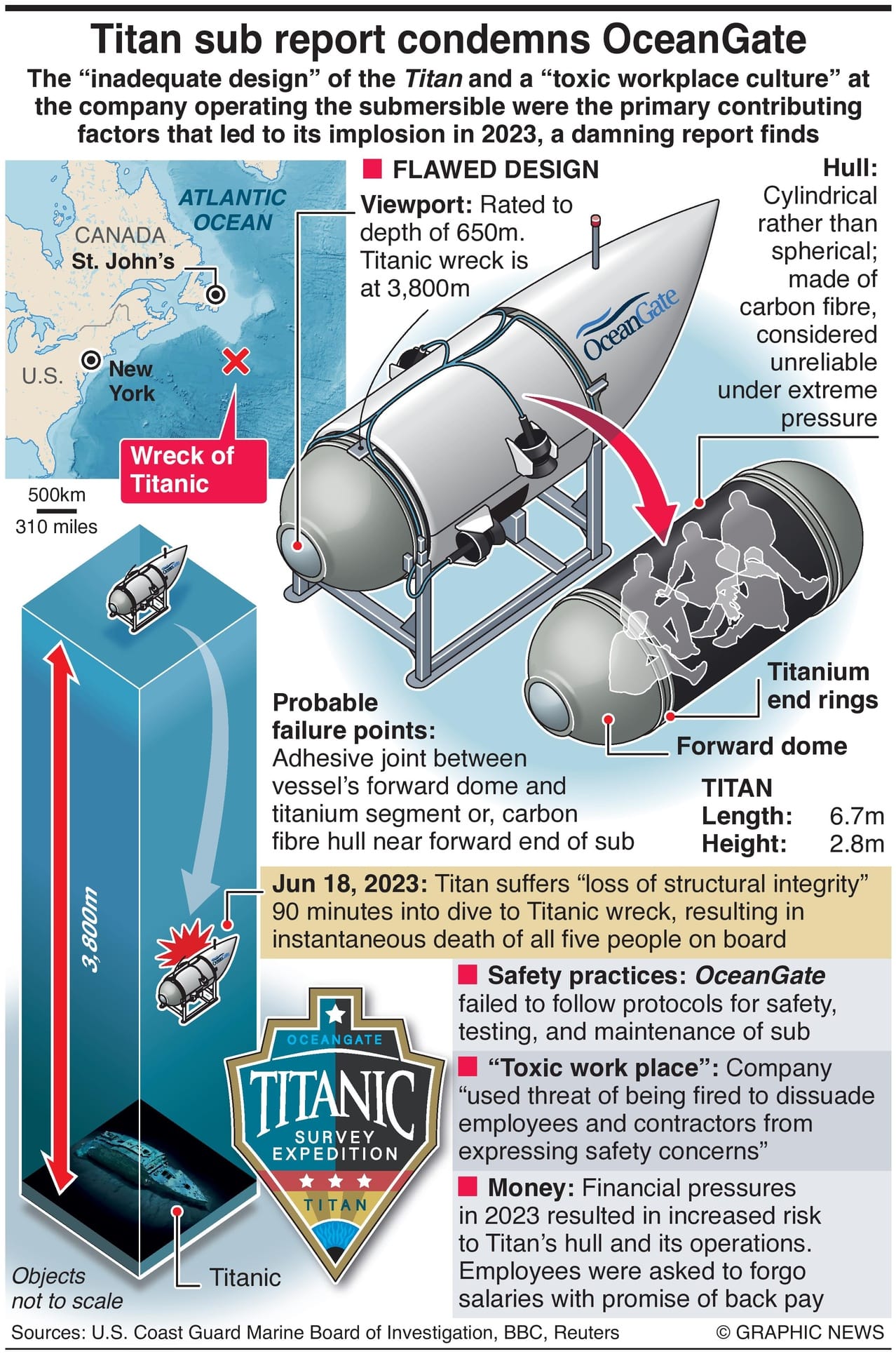 The “inadequate design” of the Titan and a “toxic workplace culture” at the company operating the submersible were the primary contributing factors that led to its implosion in 2023, a damning report finds