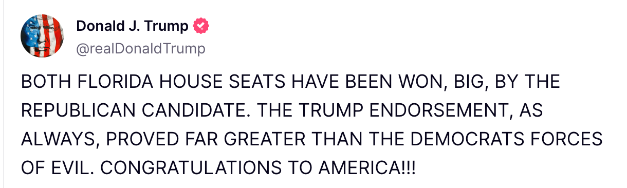 Fine won in the 6th District, securing a victory over Democrat Josh Weil for the seat vacated by Mike Waltz. Both candidates benefited from President Trump’s endorsement, with Trump claiming credit for the victories on his Truth Social platform.