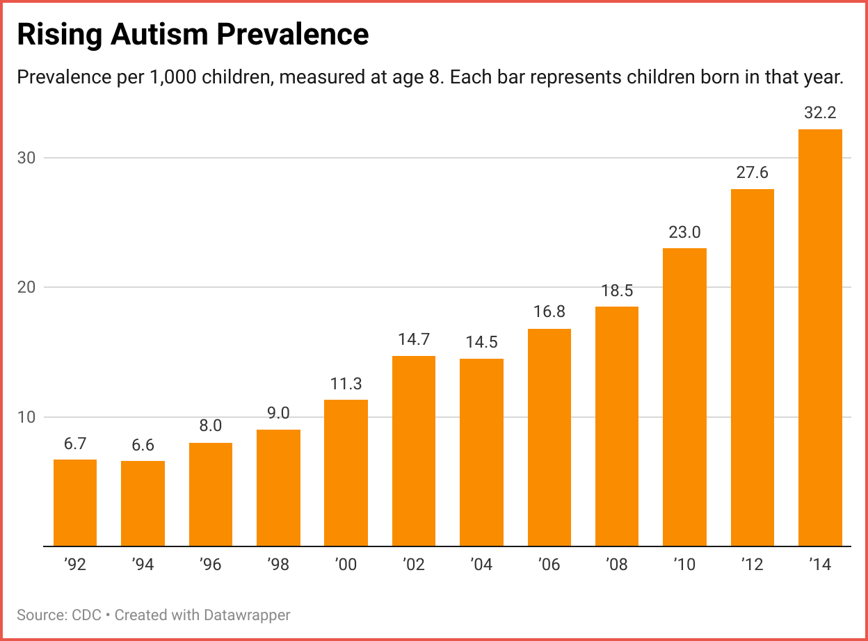 Autism diagnoses have risen sharply in recent decades. The CDC’s most recent estimate, for children born in 2014 and assessed in 2022, puts the figure at about 1 in 31, continuing a decades-long upward trend. By contrast, among those born in 1994, the figure was just 1 in 150. In simple terms, that’s a fivefold increase.