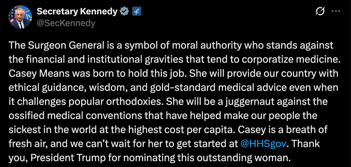 Health and Human Services Secretary Robert F. Kennedy Jr. publicly endorsed President Donald Trump's nominee for U.S. Surgeon General, Casey Means, calling her "born to hold this job" and praising her as a “juggernaut” against outdated medical conventions. In a post on X, Kennedy described Means as a source of “ethical guidance, wisdom, and gold-standard medical advice,” and thanked Trump for the nomination.