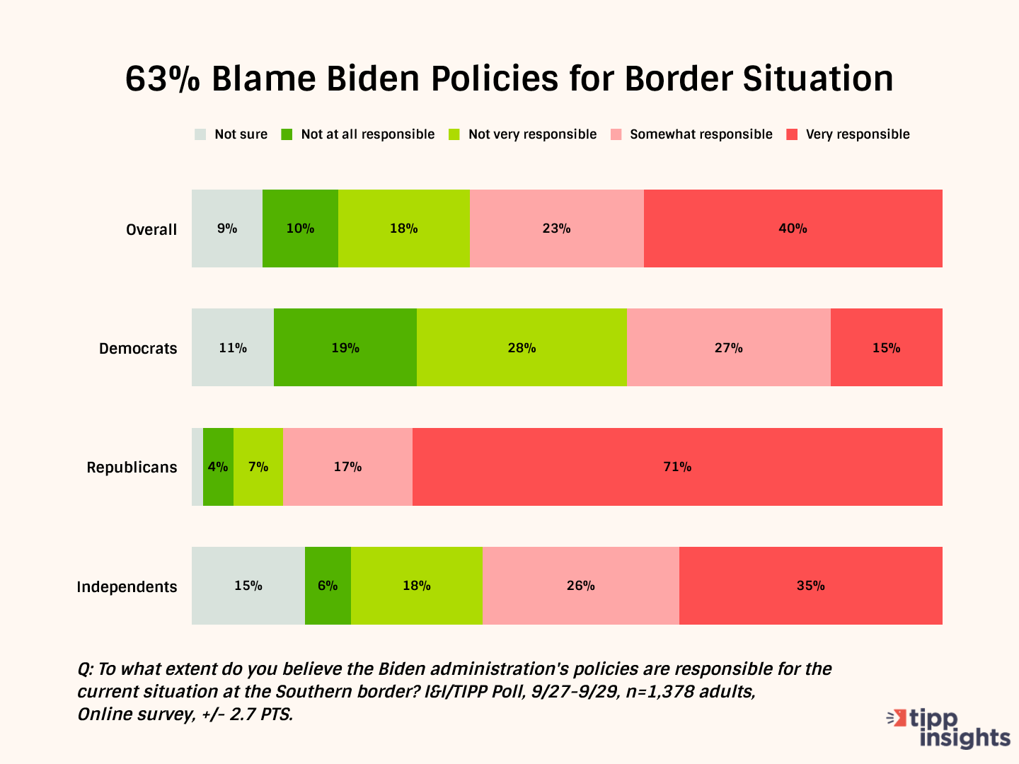 I&I/TIPP followed up with a second question: “To what extent do you believe the Biden administration’s policies are responsible for the current situation at the Southern border?” The possible answers were: “Very responsible,” “Somewhat responsible,” “Not very responsible,” “Not at all responsible,” and “Not sure.”