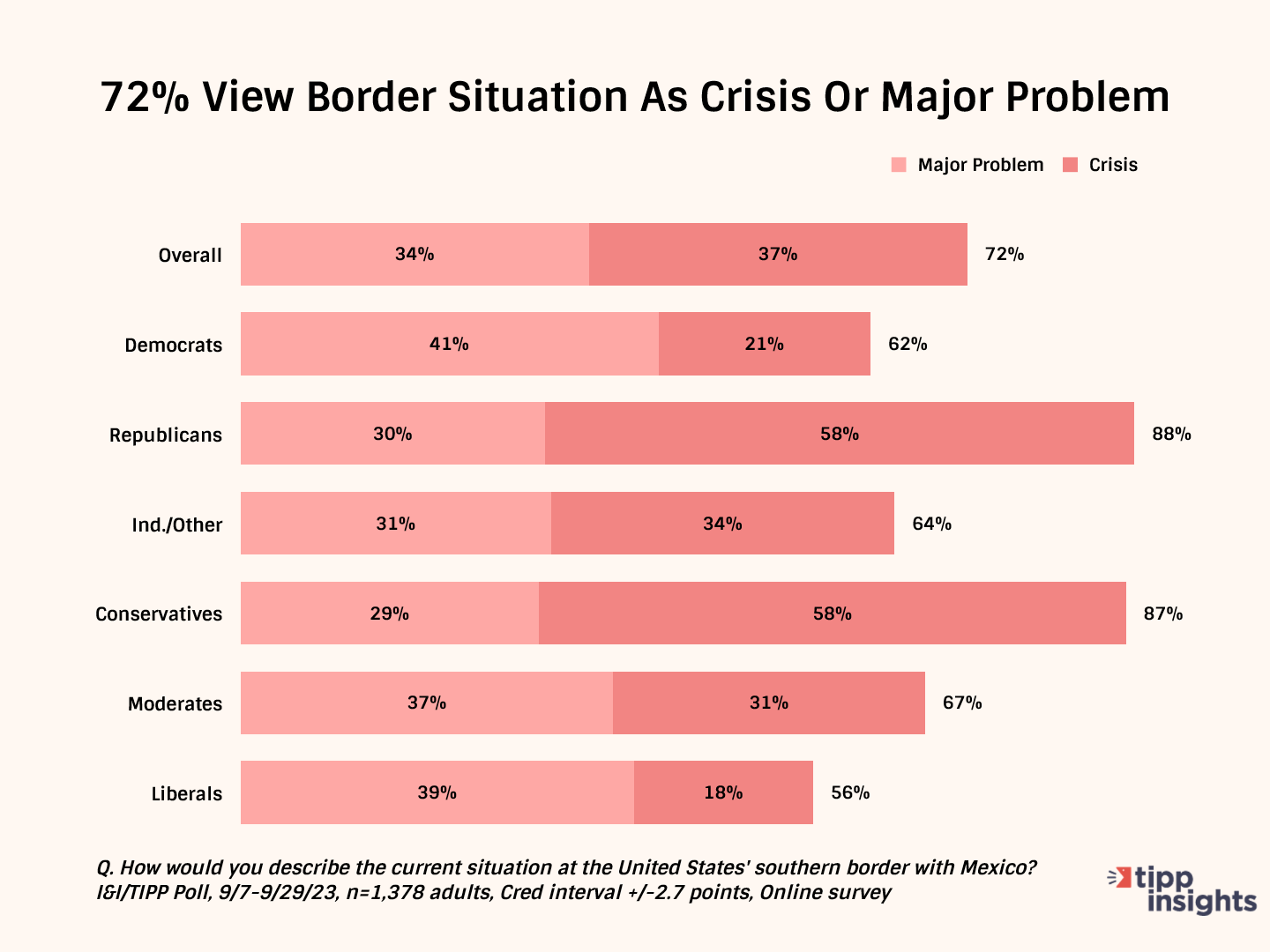 With a record surge of illegal immigrants into the U.S., I&I/TIPP asked the 1,378 voters who responded to the national online poll, which was taken from Sept. 27-29: “How would you describe the current situation at the United States’ southern border with Mexico?”