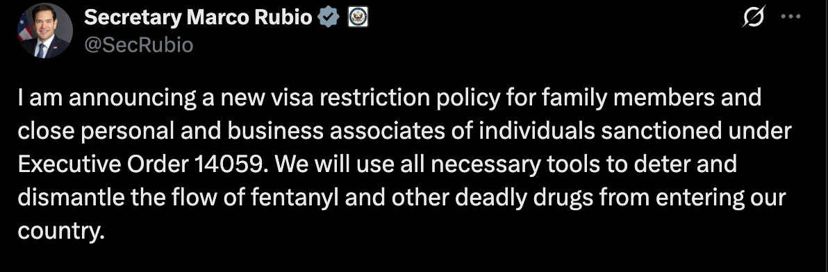 Secretary of State Marco Rubio announced a new visa restriction policy targeting relatives and associates of individuals sanctioned under Executive Order 14059, as part of the U.S. effort to curb the flow of fentanyl and other deadly drugs.